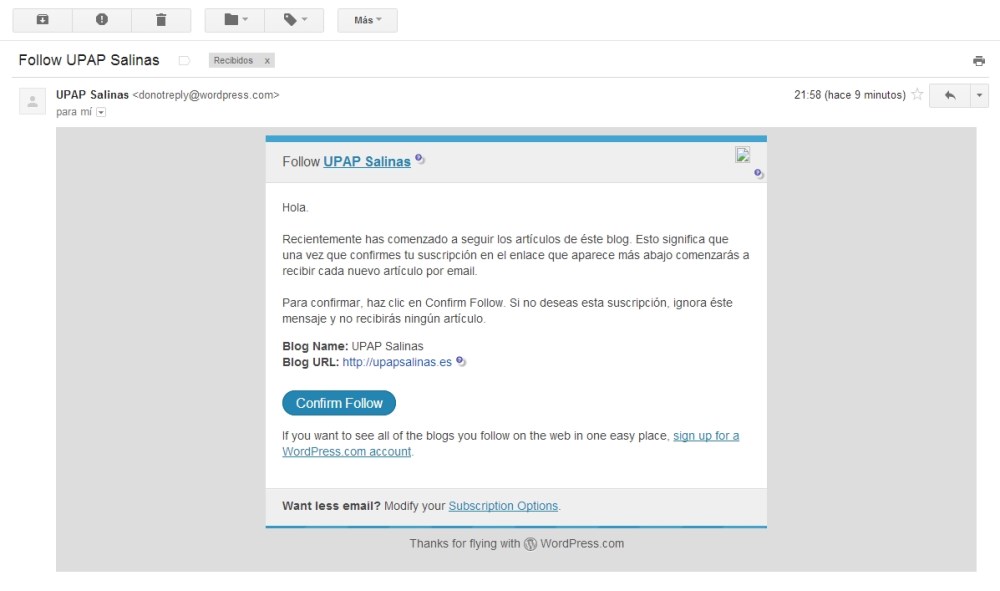 Ya sólo queda que, cuando entres en tu e-mail, abras el correo que te habrá llegado pidiéndote que confirmes la suscripción. Con hacer clic en el botón que pone «Confirm follow» ya estará terminado el proceso.
