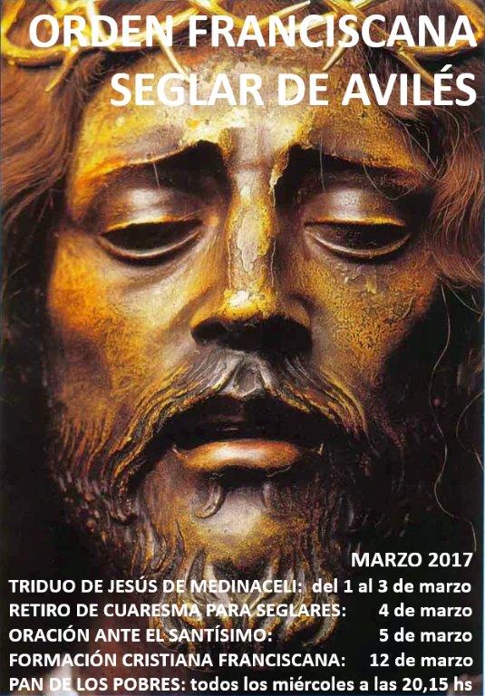 Orden Franciscan Seglar de Avilés. 25Feb 201725 Feb 2017 ORDEN FRANCISCANA SEGLAR DE AVILES: ACTIVIDADES MARZO 2017. Triduo de Jesús de Medinaceli: 1 al 3 de Marzo 2017. Retiro Cuaresma para Seglares: 4 Marzo 2017. Oración ante el Santísimo: 5 de Marzo 2017. Formación Cristiana Franciscana: 12 marzo 2017. Pan de los Pobres: Todos los miércoles a las 20,15 horas. Comparte esto: Compartir en X (Se abre en una ventana nueva) X Comparte en Facebook (Se abre en una ventana nueva) Facebook Compartir en Tumblr (Se abre en una ventana nueva) Tumblr Haz clic en Pinterest (Se abre en una ventana nueva) Pinterest Enviar un enlace a un amigo por correo electrónico (Se abre en una ventana nueva) Correo electrónico Imprimir (Se abre en una ventana nueva) Imprimir Me gusta Cargando... Relacionado