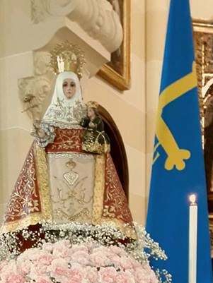 Así luce la Santina de Covadonga en el interior de la Parroquia de Nuestra Señora del Carmen de Salinas para su Novena Anual. Invitamos a todos los feligreses a participar en ella, para así recibir las Gracias de Nuestra Madre.
