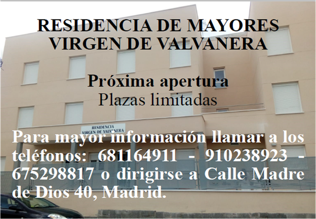 Las Hermanas Dominicas Hijas de Nazareth, que asisten a nuestra parroquia de Salinas – han abierto en Madrid la Residencia para Mayores Virgen de Valvaneda. Las personas interesadas pueden solicitar plaza en esta Residencia Nueva y Moderna donde nuestros ancianos encontrarán abrigo, cariño, atenciones y cuidados dentro de la caridad cristiana y donde formarán una familia llena de amor y comprensión.