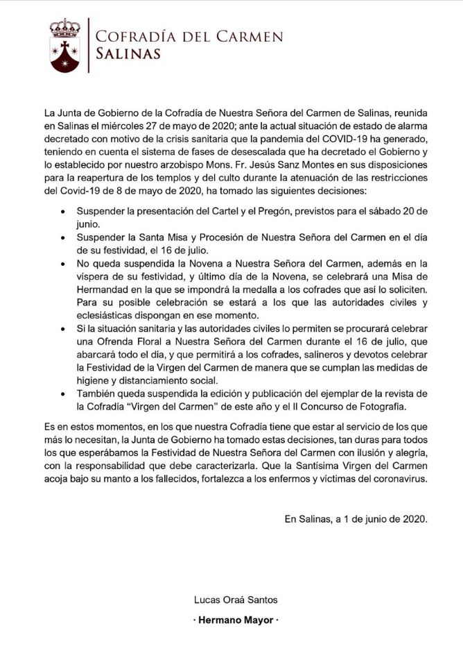 Comunicado de laCofradía de Ntra. Sra. del Carmen de Salinas- Suspendida la Procesión del Carmen.