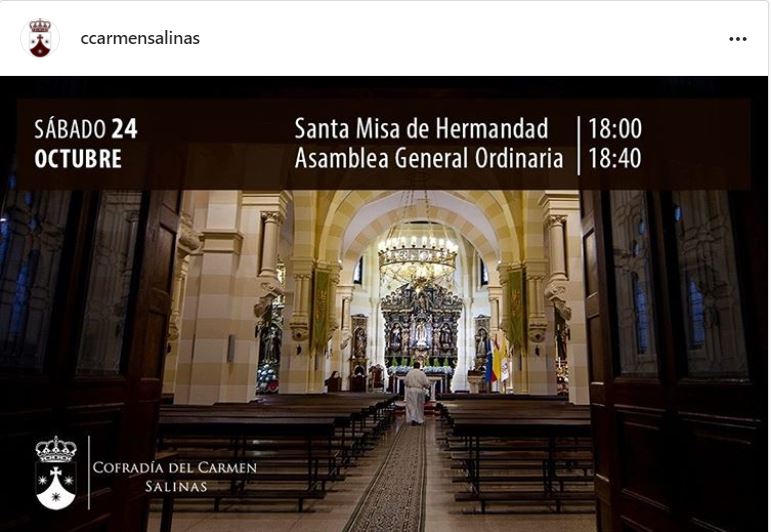 Recordamos que hoy Sábado 24 de Octubre de 2020, en Nuestra Iglesia Parroquial de Nuestra Señora del Carmen de Salinas, a las 18 horas se Celebrará la Misa de Hermandad de todos los Cofrades. A continuación tendrá lugar la Asamblea General Ordinaria. Rogamos la máxima asistencia.