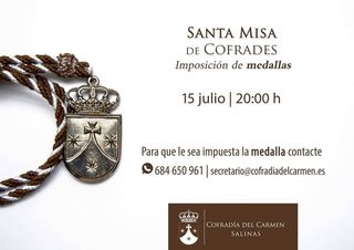 CULTOS | El último día del Solemne Triduo en honor a Nuestra Señora del Carmen, que se va a celebrar entre los días 13 y 15 de julio, tendrá lugar la Santa Misa de Hermandad en la que se impondrán las medallas a los nuevos cofrades que así lo soliciten.