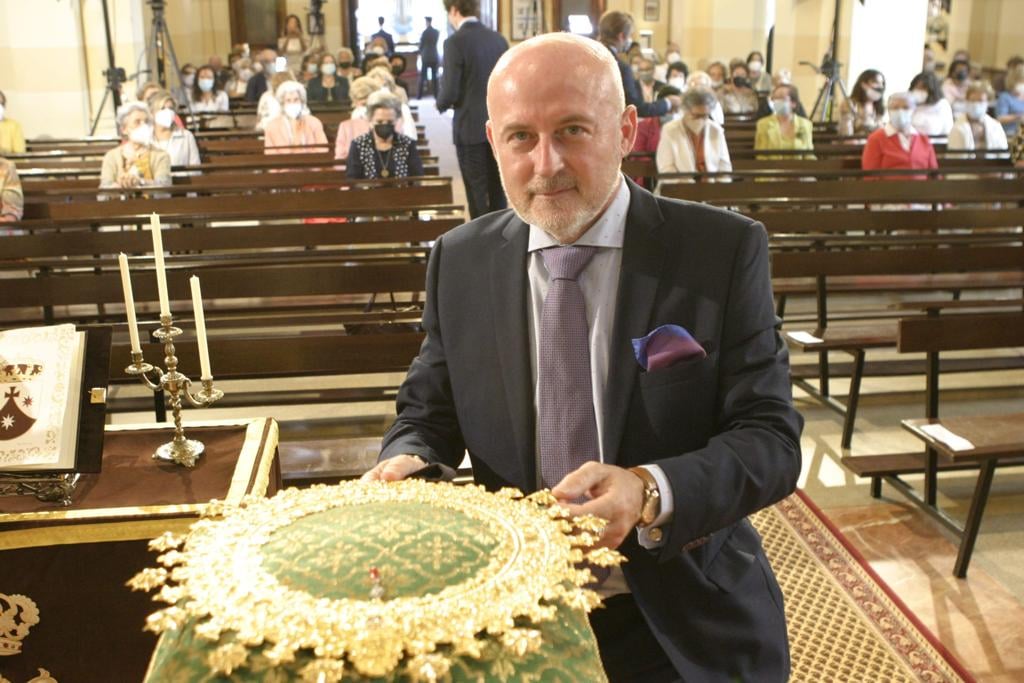 El orfebre sevillano Paco Rivero junto al halo que realizó para Nuestra Madre y que le fue impuesto el pasado 16 de julio por nuestro Arzobispo, Fr. Jesús Sanz Montes. #SoyDelCarmen#PatronaDeSalinas
