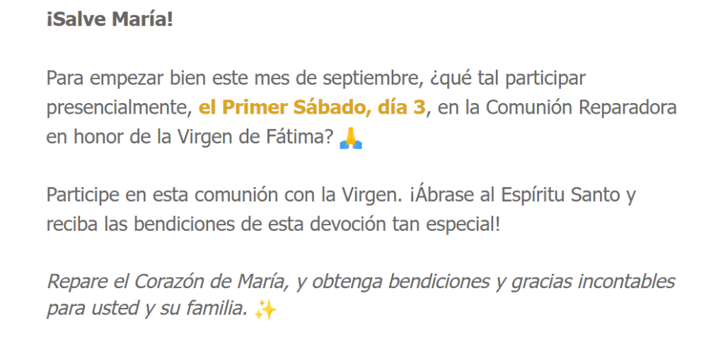 Sábado 3 de septiembre de 2022, nuestra Iglesia Parroquial de Nuestra Señora del Carmen de Salinas celebra su Misa habitual y diaria a las 20.00 h. En la Celebración de la Santa Misa podrás realizar la Comunión Reparadora de los Primeros Sábados de Mes, tal y como desea Nuestra Madre la Virgen de Fátima. !Te esperamos! Vence tu pereza, haz un esfuerzo y acércate a recibir al Señor en la Sagrada Eucaristía. Recordemos también que para recibir la Comunión es necesario estar en Gracia de Dios, por eso haz un «examen de conciencia» y realiza el Sacramento del Perdón, el Sacramento de la Reconciliación o de la Confesión ante el «sacerdote». Dios te Bendiga y María te proteja. !SALVE MARÍA!.