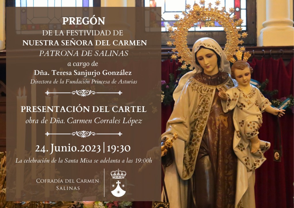PREGÓN 2023 | Acto del Pregón de la Festividad de Nuestra Señora del Carmen a cargo de Dña. Teresa Sanjurjo González, Directora de la Fundación Princesa de Asturias en la Parroquia de Salinas el próximo sábado 24 de junio a las 19:30h. Durante el acto se presentará el cartel anunciador de la Festividad, obra de Dña. Carmen Corrales.