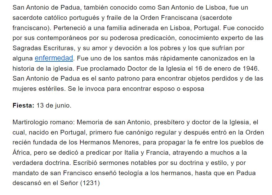 Martirologio Romano: Memoria de san Antonio, presbítero y doctor de la Iglesia, que, nacido en Portugal, primero fue canónigo regular y después entró en la Orden recién fundada de los Hermanos Menores, para propagar la fe entre los pueblos de África, pero se dedicó a predicar por Italia y Francia, donde atrajo a muchos a la verdadera fe. Escribió sermones notables por su doctrina y estilo, y por mandato de san Francisco enseñó teología a los hermanos, hasta que en Padua descansó en el Señor. († 1231). Fecha de canonización: 1 de junio de 1232 durante el pontificado de Gregorio IX.