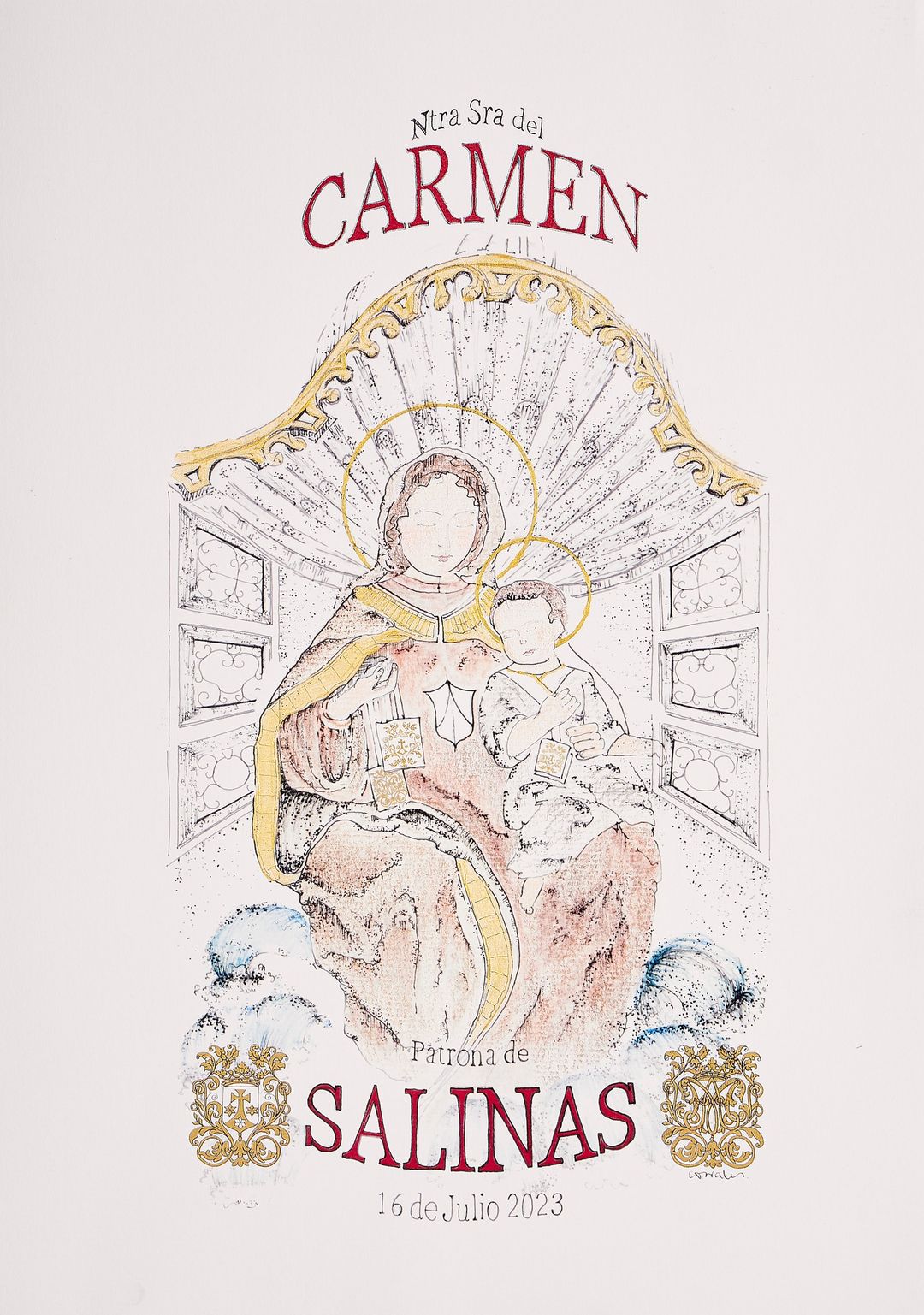 CARTEL | En el día de ayer, durante el transcurso del acto del Pregón, fue presentado el Cartel anunciador de la Festividad de Nuestra Señora del Carmen, Patrona de Salinas, obra de Dña. Carmen Corrales. Nuestras Felicitaciones a la autora y creadora de éste cartel tan precioso y emotivo.