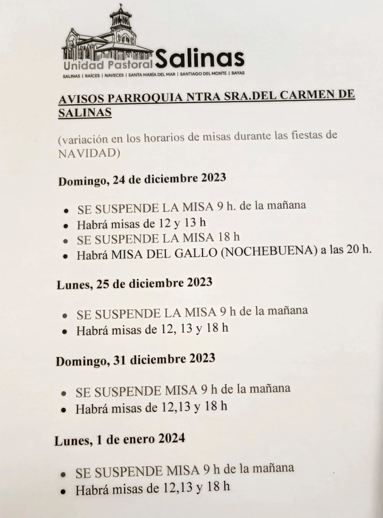 Horarios para estas Navidades, en Nuestra Parroquia de Salinas.