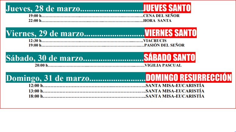Horarios de Cultos Semana Santa, en la Parroquial del Carmen de Salinas. 2024 16Mar 202416 Mar 2024 Horarios en Formato PDF upap-salinas-semana-santa-horarios-2024-salinas-pdfDescarga Comparte esto: Haz clic para compartir en X (Se abre en una ventana nueva) X Haz clic para compartir en Facebook (Se abre en una ventana nueva) Facebook Haz clic para compartir en Tumblr (Se abre en una ventana nueva) Tumblr Haz clic para compartir en Pinterest (Se abre en una ventana nueva) Pinterest Haz clic para enviar un enlace por correo electrónico a un amigo (Se abre en una ventana nueva) Correo electrónico Haz clic para imprimir (Se abre en una ventana nueva) Imprimir Me gusta Cargando... Relacionado