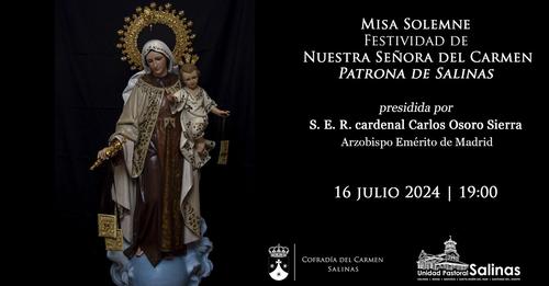 Festividad de Nuestra Señora del Carmen – Salinas – . 16Jul 202417 Jul 2024 Celebraciones en Honor de Nuestra Señora del Carmen: 16 de julio de 2024. Santa Misa Preside la Eucaristía su Eminencia el Cardenal Carlos Osoro Comparte esto: Haz clic para compartir en X (Se abre en una ventana nueva) X Haz clic para compartir en Facebook (Se abre en una ventana nueva) Facebook Haz clic para compartir en Tumblr (Se abre en una ventana nueva) Tumblr Haz clic para compartir en Pinterest (Se abre en una ventana nueva) Pinterest Haz clic para enviar un enlace por correo electrónico a un amigo (Se abre en una ventana nueva) Correo electrónico Haz clic para imprimir (Se abre en una ventana nueva) Imprimir Me gusta Cargando... Relacionado