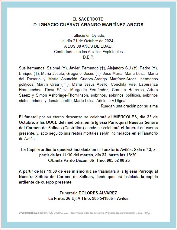 Esta pasada noche ha fallecido don Ignacio Cuervo Arango; sacerdote que natural de nuestro Arciprestazgo, trabajó en el mismo, ya jubilado colaboró estrechamente en la Unidad Pastoral de Salinas . El funeral ,presidido por el Sr. Vicario General será (D.M) el miércoles 23 a las 12 h en el templo parroquial de Salinas. Descanse en la Paz del Señor (+)