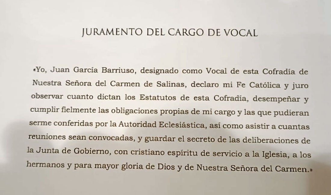 En la tarde hoy sábado 4 de enero, han Jurado su cargo y tomado posesión los nuevos miembros de la Junta de gobierno de nuestra Cofradía de la Virgen del Carmen. Felicitarles por su valentía y dedicación, deseándoles el mayor de los éxitos que sin duda serán los de Nuestra Madre la Virgen del Carmen Patrona de Nuestra Parroquia y de Salinas.