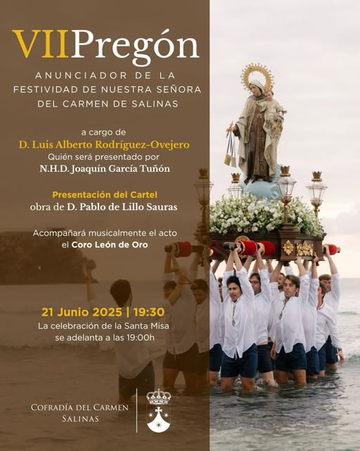 PREGÓN 2025 | El próximo sábado 21 de junio, a las 19:30h, en la Iglesia Parroquial, tendrá lugar el Pregón de la Festividad de Nuestra Señora del Carmen, este año a cargo de D. Luis Alberto Rodríguez-Ovejero