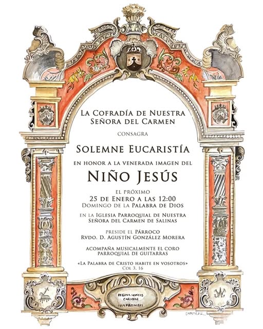 El próximo 25 de enero, Domingo de la Palabra de Dios, a las 12:00 horas, la Cofradía de Nuestra Señora del Carmen de Salinas consagra Solemne Eucaristía en Honor de la Venerada Imagen del Niño Jesús.