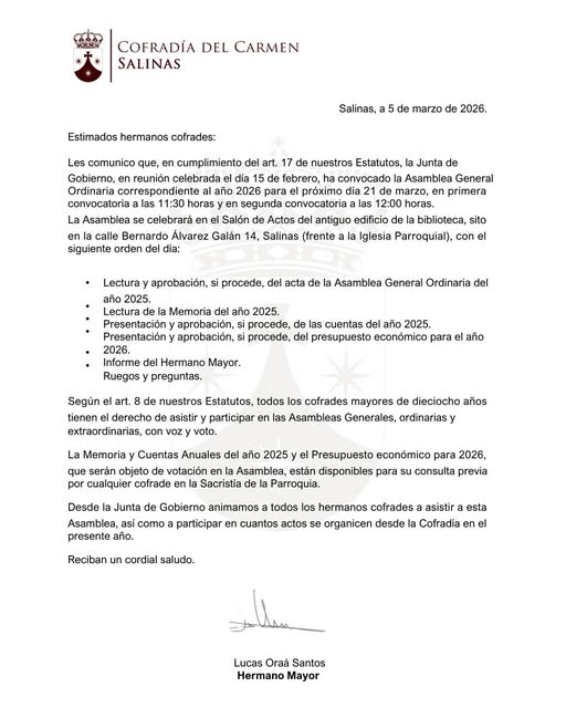 La Junta de Gobierno ha convocado la Asamblea General Ordinaria correspondiente al año 2026, que se celebrará el próximo 21 de marzo.