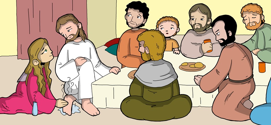 María, hermana de Lázaro, unge los pies de Jesús en Betania.
