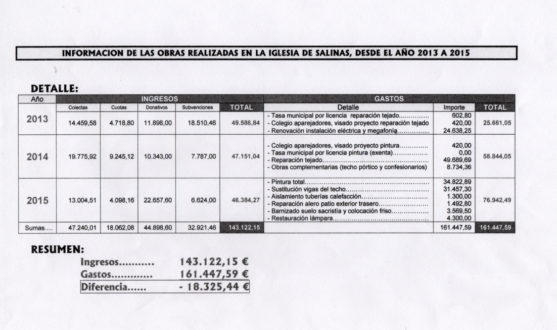 Durante los tres últimos años, se han venido realizando diversas obras en nuestro templo parroquial de Salinas, como renovación de la red eléctrica, megafonía, renovación total del tejado, sustitución de las vigas del techo, aislamiento de las tuberías de calefacción, reparación de los aleros exteriores traseros, barnizado del suelo de la sacristía con colocación de friso, restauración de la lámpara interior de la Iglesia, pintura interior y exterior del templo, amén de otras obras de menor envergadura.